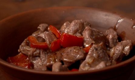 15. Готовим второй гарнир. Очищаем и тонко нарезаем красный лук, болгарский перец.