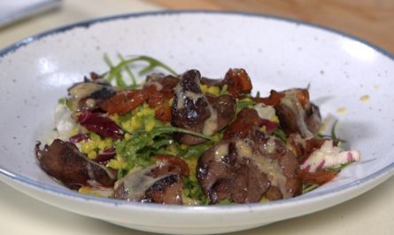 3. Добавьте горошек и консервированные томаты. Полейте ингредиенты растительным маслом. Посолите.