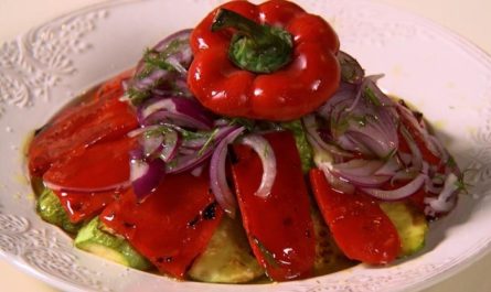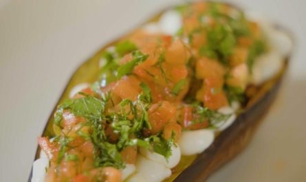 6. Выложить начинку на ломтики багета. Сверху сбрызнуть оливковым маслом, посолить.