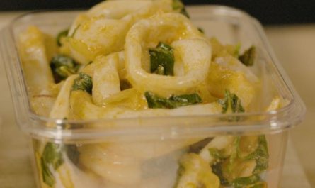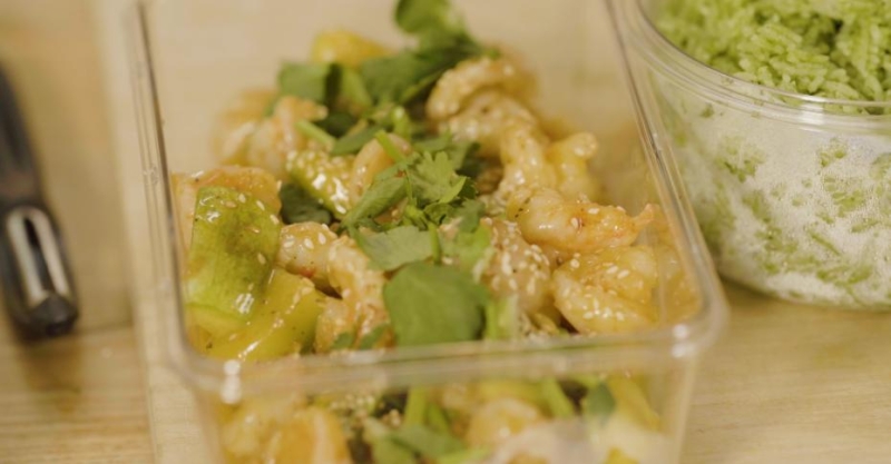 3. Креветки разрежьте на две части.